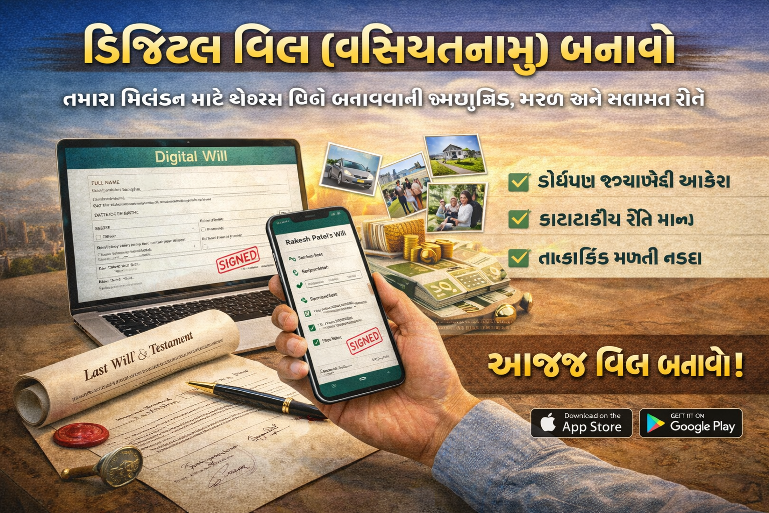 👉 આજેજ તમારું ડીઝીટલ વિલ (વસિયતનામું) બનાવો અને તમારા પરિવારનું ભવિષ્ય સુરક્ષિત બનાવો.